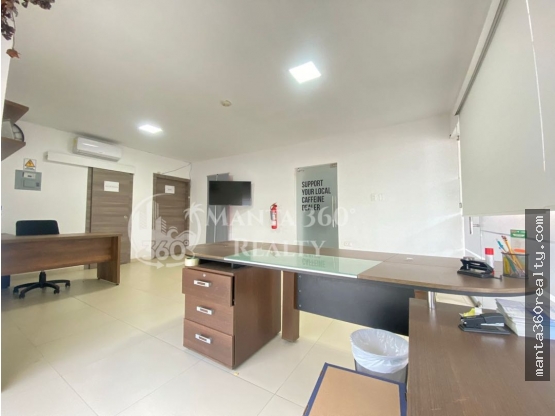 Oficina en alquiler ubicada en el centro de Manta, sobre la calle 11, en planta baja de un edificio corporativo moderno que cuenta con ascensor, cámaras de seguridad en las áreas comunes y acceso con reconocimiento biométrico (Face ID).